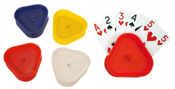 Porte cartes triangulaires pour aider dans la préhension. Ne nécessitant pas une pression prolongée, il soulage la main du joueur. Les cartes sont maintenues par 2 disques qui sont maintenus grâce à un ressort.
